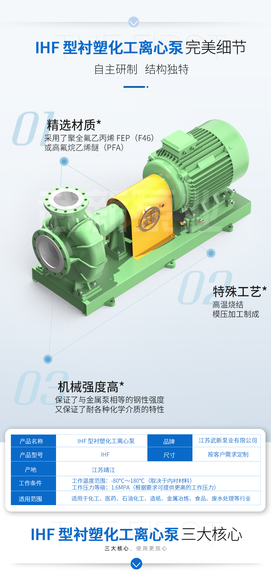 IHF 內襯氟塑料化工離心泵的過流部位采用了聚全氟乙丙烯 FEP(F46)或高氟烷乙烯醚(PFA),經特殊工藝高溫燒結后與泵體及部件模壓加工制成。使氟塑料與金屬部件緊密牢固的錨定為一體,既保證了與金屬泵相等的鋼性強度,又保證了耐各種化學介質的特性。該泵具有耐高溫、耐高壓、耐強腐;機械強度高、經濟實惠、使用壽命長、適用范圍廣等優(yōu)點。