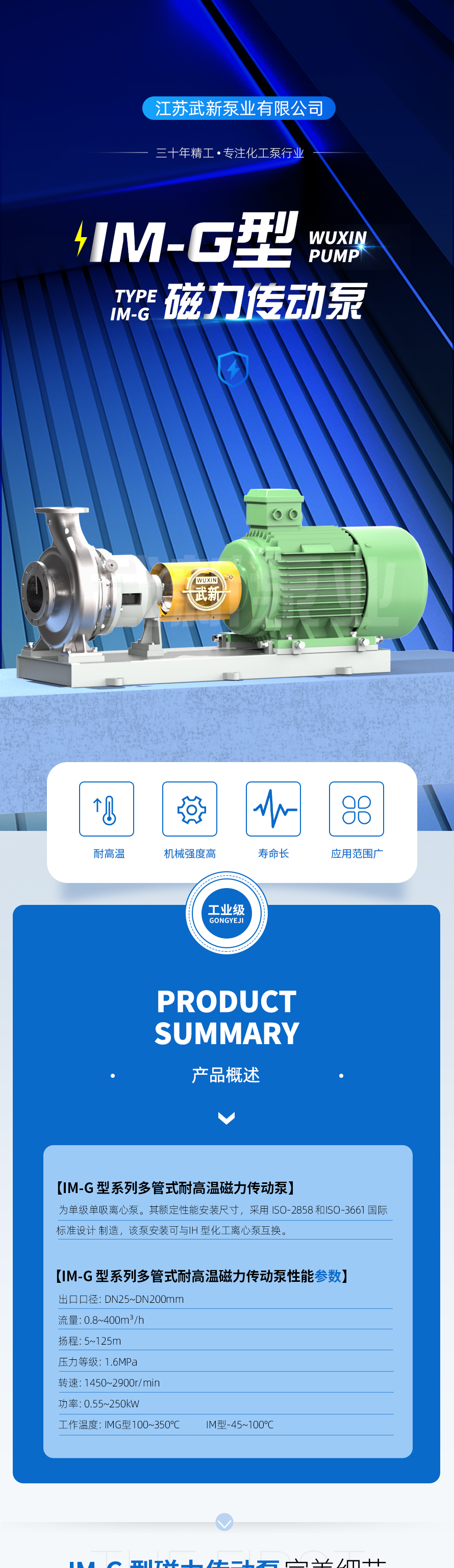 IM-G 型系列多管式耐高溫磁力傳動泵,為單級單吸離心泵。其額定性能安裝尺寸,采用 ISO-2858 和ISO-3661 國際標準設計 制造,該泵安裝可與IH 型化工離心泵互換。
